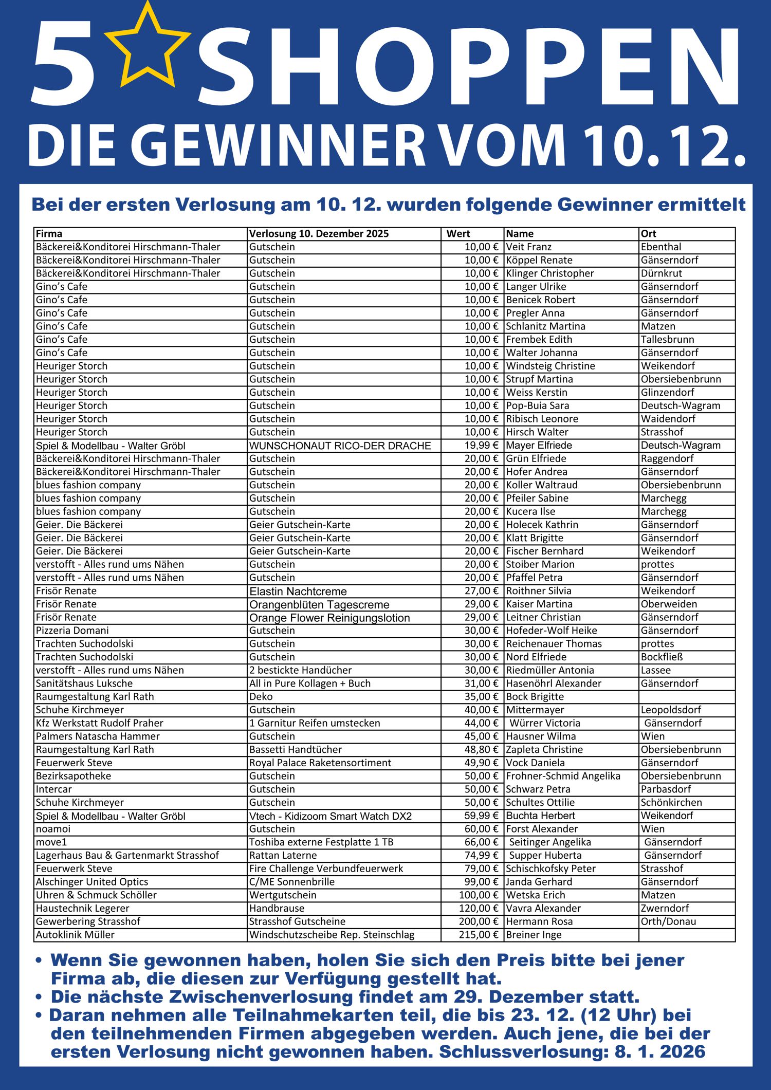 Nach dem Marienfeiertag fand die erste Verlosung des diesjährigen 5-Sterne-Shopping von werbe-team Gänserndorf und Gewerbering Strasshof statt.