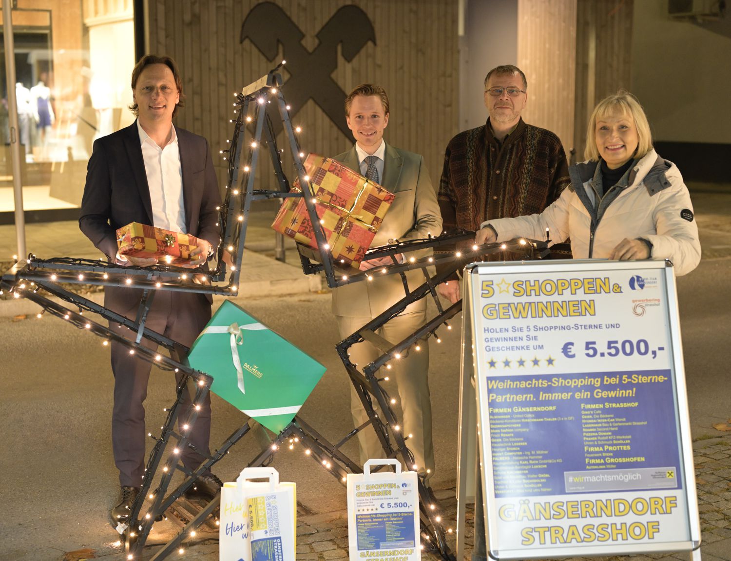 Werbe-team-Chefin Franziska Berthold, Gewerbering-Obmann Rudolf Praher, sowie Sandro Eggenberger und Johannes Jaindl von der Raika (von rechts) Foto: Leo Berthold Pickerln sammeln und gewinnen GÄNSERNDORF/STRASSHOF - 26 Firmen mit 29 Geschäften beteiligen sich am dreizehnten.[...]